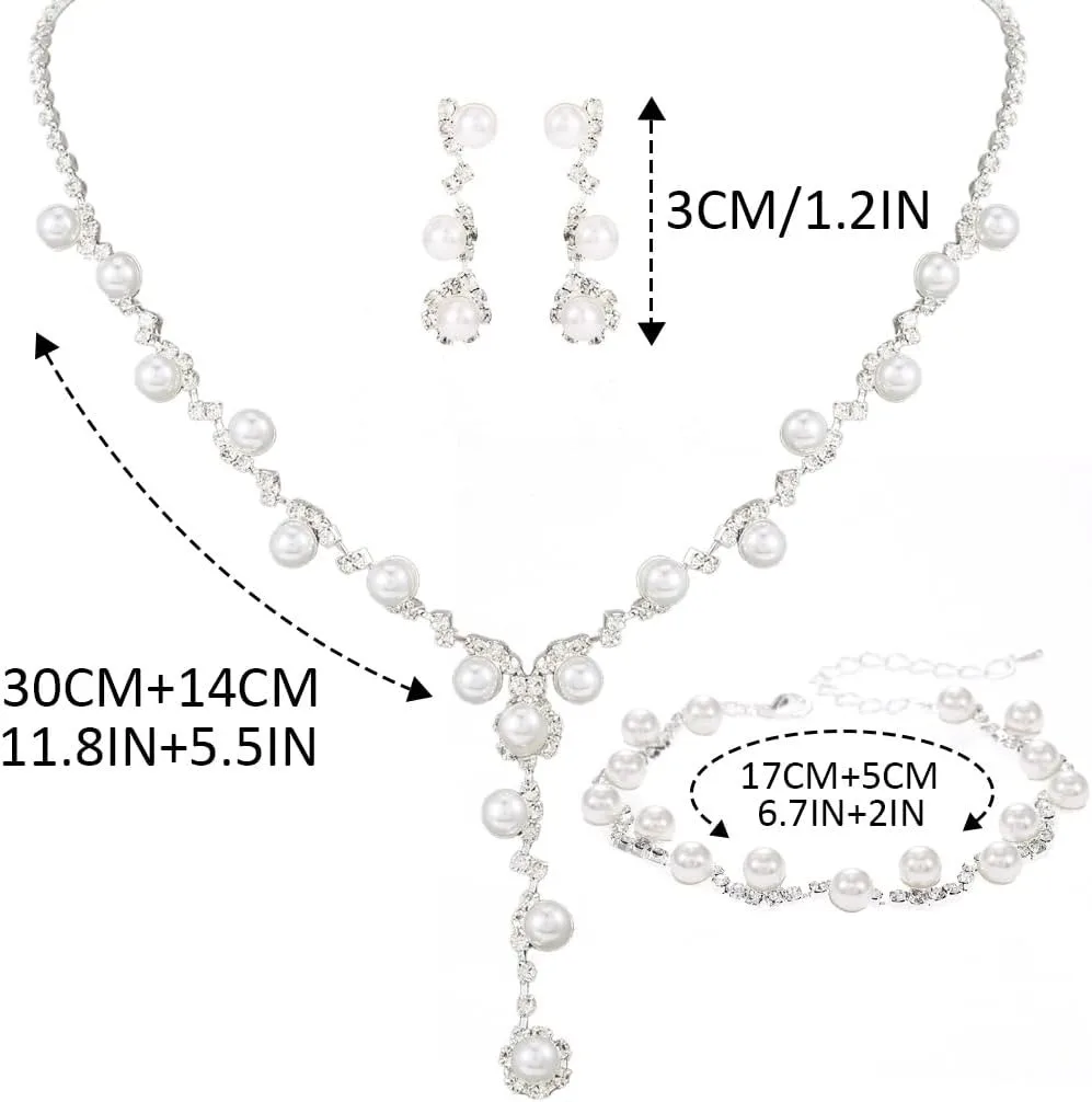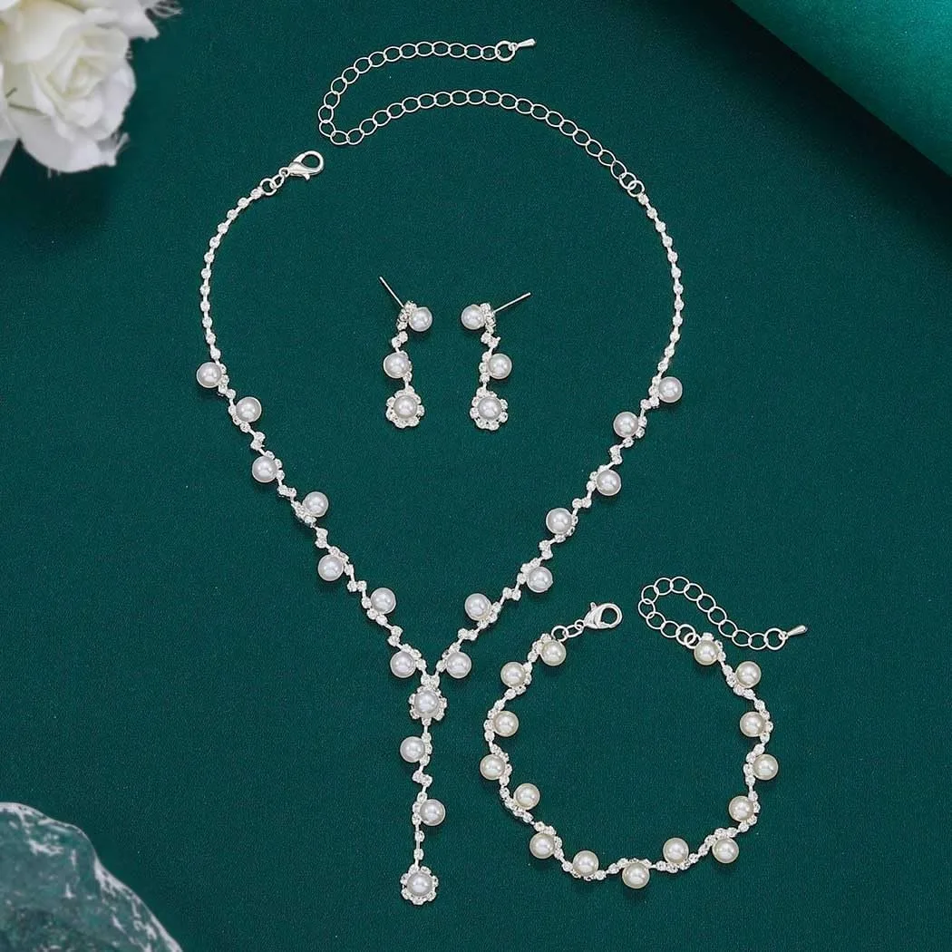 Parure de Mariage Élégante – Collier, Boucles d’Oreilles et Bracelet Perles & Strass Argentés | Bijoux de Mariée Raffinés